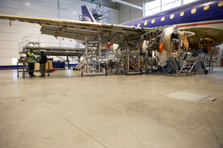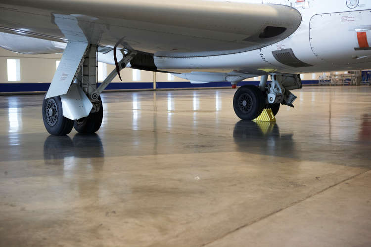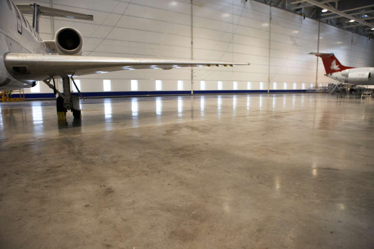 Réalisation d’un dallage non armé lissé mécaniquement recouvert d’un durcisseur minéral.