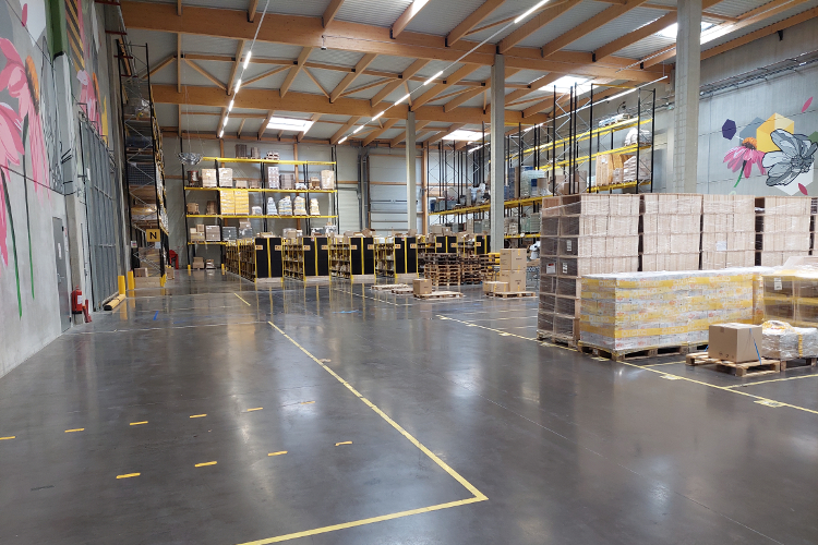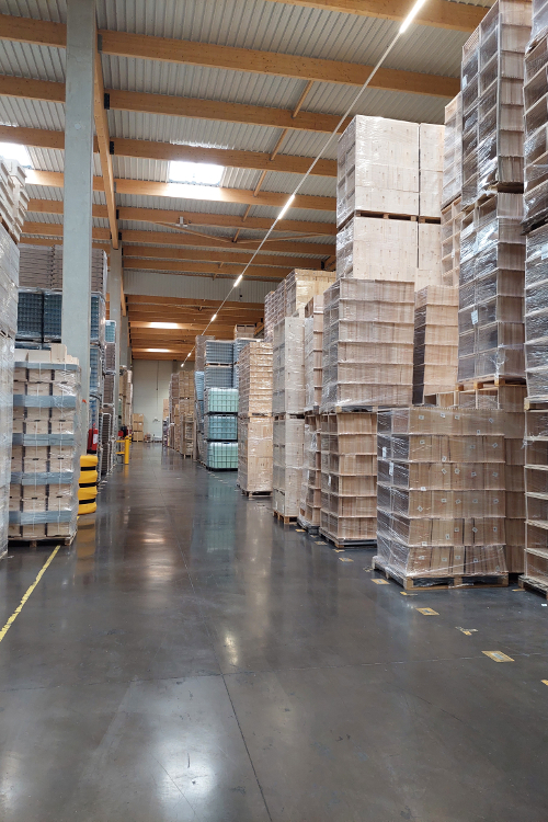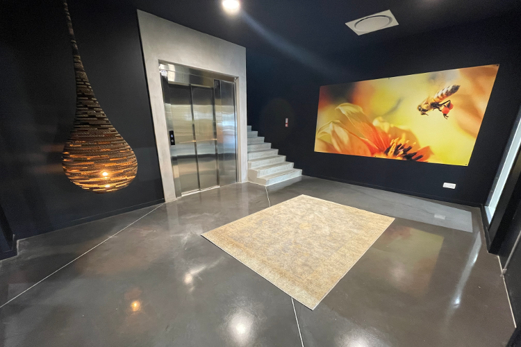 L’ensemble des dallages intérieurs (bureaux, locaux sociaux, showroom, production, logistique) ont été lissés mécaniquement avec incorporation d’un durcisseur minéral anthracite.