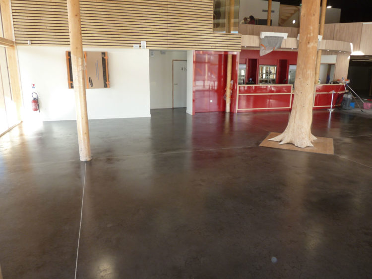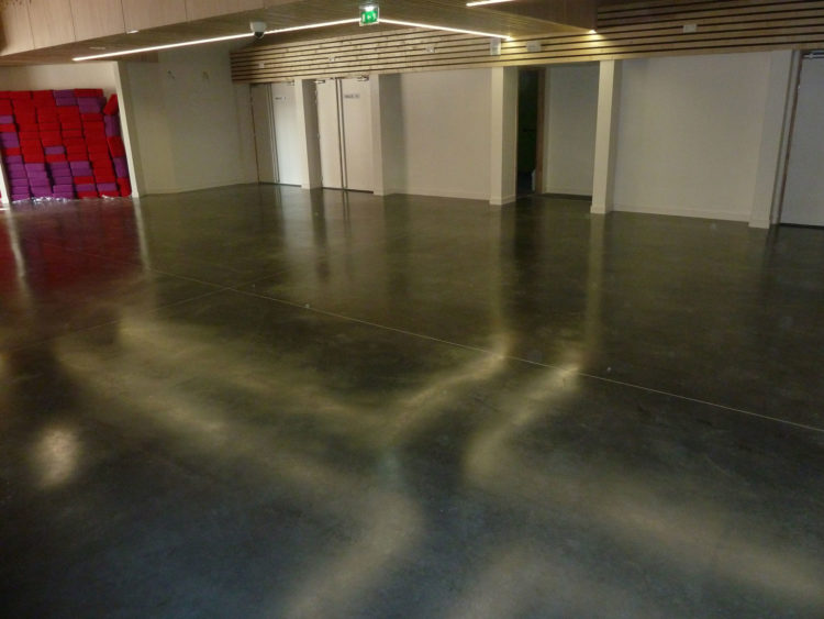 La surface du dallage est lissée mécaniquement avec incorporation d’un durcisseur minéral teinté gris anthracite. Après un temps de séchage, une cire a été appliquée afin d’améliorer l’esthétique du dallage.